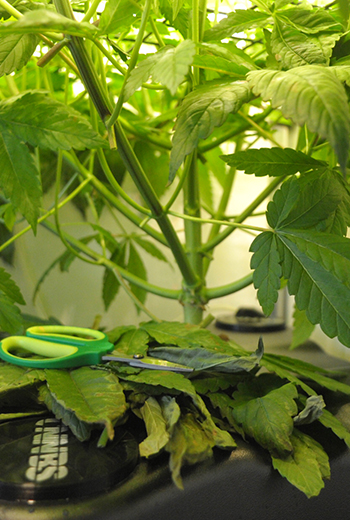 Afgelopen week ben ik voorzichtig begonnen met dieven. Ik doe dit in twee etappes om te voorkomen dat de AK Choco Kush ongewenst begint te strekken. Tot nu toe heb ik alleen wat sporadisch slaphangende blaadjes weggehaald. Vorige week ben ik begonnen met dieven, deze week ga ik voor de tweede ronde. De kleine, dunne takjes onder het scrogrek gaan eraf, zodat de plant zich kan gaan concentreren op waar we allemaal dol op zijn: dikke, vette, plakkerige, geurende toppen!