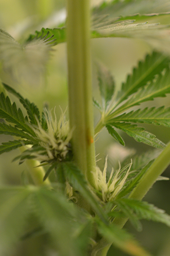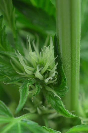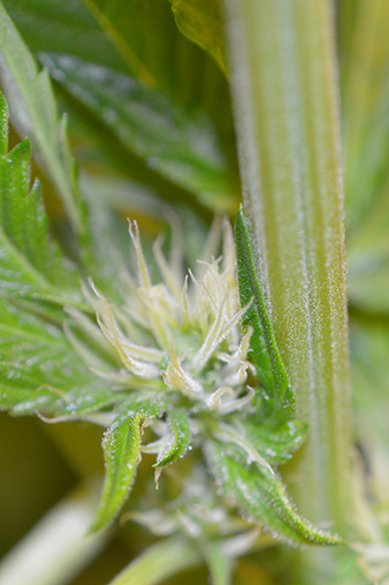 En dan natuurlijk het leukste van deze week: de toppen. Een week geleden waren het nog maar kleine bolletjes maar inmiddels mag ik ze van mezelf toppen noemen. Heel dik en groot zijn ze nog niet maar het is dan ook pas de tweede week van de bloeifase. Je ziet wel goed dat ze nog veel groter zullen worden aan de dikte van de stammen, die op dit moment bijna nog dikker zijn dan de toppen zelf. Trichomen zijn er nog niet dus ik gebruik alleen nog de basisvoeding en de C4 van Mills. Wanneer ik in de vierde, vijfde bloeiweek wel trichomen zie, vervang ik de C4 voor Mills Ultimate PK.
