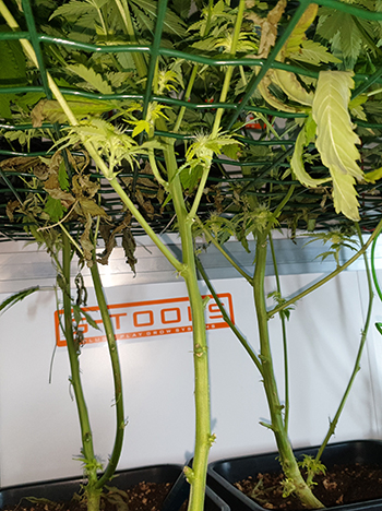 Toen ik de tak weer netjes had weggeborgen achter de deur, kon ik verdergaan waar ik mee bezig was: het inspecteren van de onderzijde van de dames in de kast. Het was me van de week al opgevallen dat er veel dode bladeren op het scrogrek lagen, en dat de toppen die net onder of boven het scrogrek groeiden wel erg licht van kleur waren. Ik ben diezelfde avond naar de dames teruggegaan om ze in het licht van de 315 Watt CMH binnenzon te bekijken.