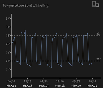 De CMH kweeklamp hangt nog steeds op dezelfde hoogte als vorige week; zo’n 26 centimeter boven de dames. De gemiddelde temperatuur van afgelopen week was 23,29 graden Celsius. De gemiddelde luchtvochtigheid van afgelopen week was 47,78 procent.