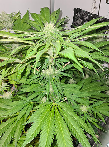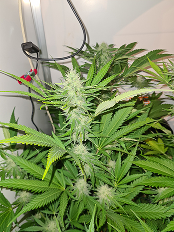 Tijdens het maken van de foto’s kwam ik er ook achter dat ik één Mohammed heb die afwijkt van de rest. De plant trok mijn aandacht omdat ze niet zo schitterde als de andere dames. Ze staat in het midden vooraan, bijna recht onder de 315 Watt CMH binnenzon. Het is een van de planten die vanuit een zaadje is groot gebracht.