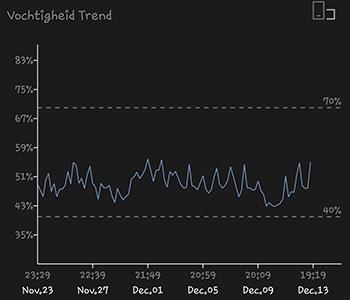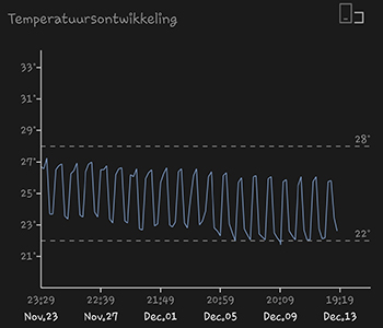 De temperatuur is de afgelopen weken al rustig aan het dalen, en was deze week gemiddeld 23,54 graden Celsius. De luchtvochtigheid is nog steeds iets aan de hoge kant met een gemiddelde van 51,55 procent. Het is wel weer minder dan vorige week maar wil hem zo rond de 45 procent hebben. Volgende week nog maar eens extra op letten. De kweeklamp hangt op een hoogte van 25 centimeters boven de hoogste top.
