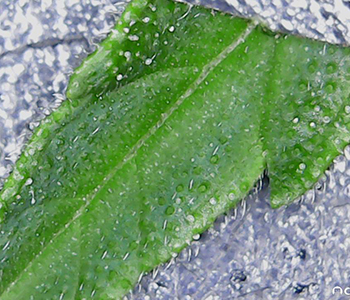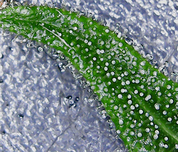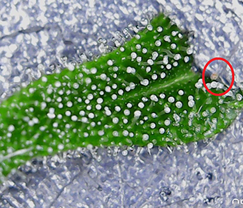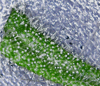 Er zijn bijna geen trichomen te vinden op het blad. En de trichomen die er wél zijn, zijn nog erg onderontwikkeld in vergelijking met het blad wat ik daarna onder de microscoop heb gelegd. Deze zit goed met bedekt met trichomen. Ze zijn al opgezwollen en hebben al een transparante licht melkachtige kleur. Het tweede blad is van de andere Mohammed die uit een zaadje is gekomen, dus daar ligt het niet aan.
