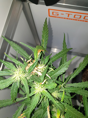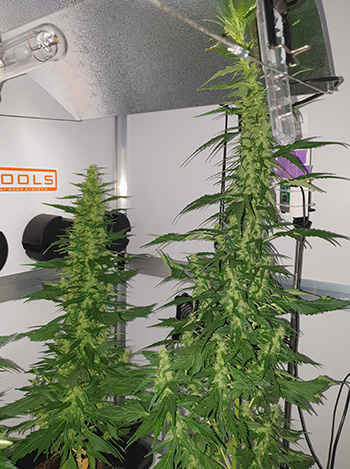 De dames worden steeds dorstiger en drinken inmiddels al 1,1 liter water met voeding per twee dagen. Qua mengverhouding gebruik ik nog steeds het voedingsschema van Plagron. De Critical Orange Punch is nog aan het herstellen van de ontmoeting met de 315 Watt CMH lamp. De schade lijkt mee te vallen en de top herstelt zich goed. De Critical Orange Punch heeft een hoogte van 58 centimeter en groeit dan nog eens 37 centimeter naar links. De eerste trichomen zijn inmiddels al te zien.