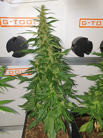 De derde Frisian Duck is vergeleken haar andere zusters een reus. Het is wel een slanke dame. Ik heb haar onder het armatuur vandaan gehaald. Ze begon hem namelijk aardig omhoog te duwen. Ze heeft een een hoogte van maar liefst 81 centimeter. De trichomen komen nog niet echt op gang bij de Frisian Ducks.