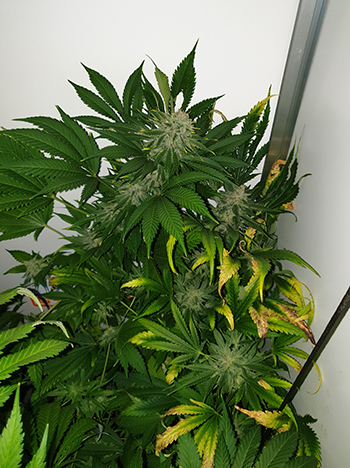 Over naar de andere, kleinere CNNBS G-Kit nu, waar nog altijd drie Sneeze wietplanten staan, eveneens in de vijfde week van hun bloeifase. De toppen zijn ook hier lekker dik aan het worden! De bladeren worden steeds geler en de dames drinken wat onregelmatiger.
