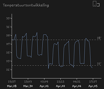 De binnenzon hangt op een hoogte van 17 centimeter boven de hoogste top. De gemiddelde temperatuur van afgelopen week was 24,88 graden Celsius. De gemiddelde luchtvochtigheid was afgelopen week 53,30 procent. Het is me helaas niet gelukt om die onder de 50 procent te krijgen. Terwijl de kamer waar de kweekkast in staat toch een luchtvochtigheid heeft van rond de 35 procent.