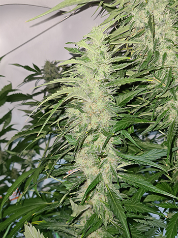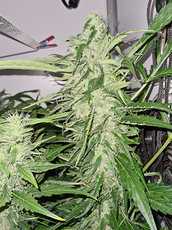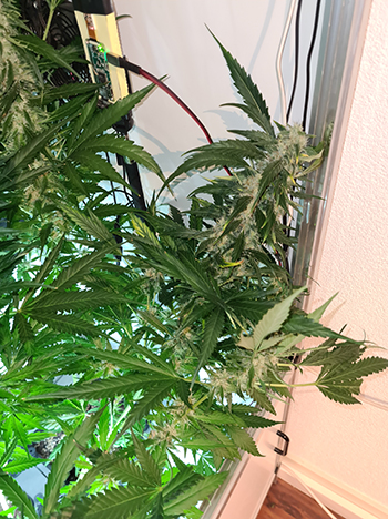 De vierde top die die achter de fitting groeide. Deze is wat onstabiel aan het worden zit vast aan het armatuur. Hij lijkt wat meer bladeren te hebben dan de andere toppen die ik heb besproken. Deze top staat als enige nog steeds redelijk dicht bij de binnenzon. Dat lijkt ook te resulteren in meer trichomen. Het suikerblad zit helemaal vol met trichomen en ook deze zijn nog redelijk transparant. De top heeft een lengte van 26 centimeter en een diameter van 5,8 centimeter.