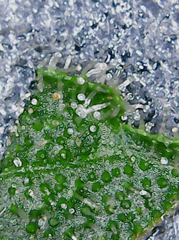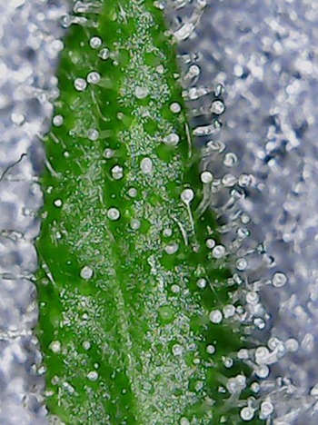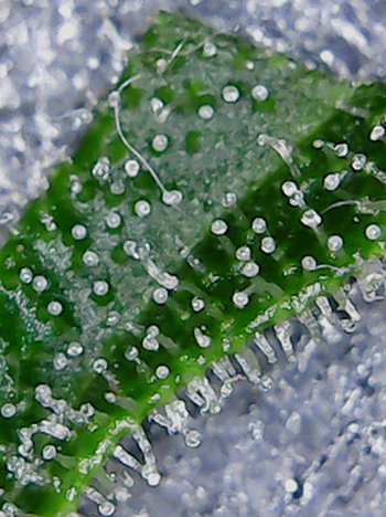 Eenmaal achter de computer lijkt het er op de foto erger uit te zien, dan in het echt. Er zit inderdaad een iets wits maar het zijn dicht op elkaar groeiende trichomen die het licht weerkaatsen. Dit is ook meteen het eerste exemplaar dat ik onder de loep neem. De top heeft een lengte van 17 centimeter en heeft op het dikste punt een diameter van 5,5 centimeter. Ik heb ook even een suikerblad onder de microscoop gelegd om de trichomen te bekijken. Deze zijn nog steeds wat transparant en met één amberkleurige zijn ze nog niet klaar voor de oogst.