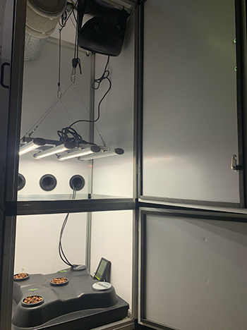 Om efficiënt met de warmte en energie om te gaan heb ik de plafondventilator (die ik de vorige ronde monteerde) laten hangen. Op deze manier wordt de warmte van de kweeklamp naar beneden geblazen en staan de zaailingen in een lekker briesje (voor een stevige stam).