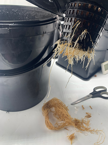 Nadat de plant met wortelrot een dagje gespoeld had in een oplossing met H2O2, heb ik haar naar de DWC-emmer verplaatst. Ik heb de lamp wat gedimd en gaf haar een lichte voedingsoplossing (EC 1,1) met T.A. ProRoots (wortelstimulator) en T.A. Silicate. Na twee dagen zag ik wat nieuwe wortels (boven het wateroppervlak), maar het groeide niet zo snel. Daarom besloot ik de bruine oude wortels weg te knippen, in de hoop dat de plant haar energie kan gaan stoppen in de gezonde wortels.