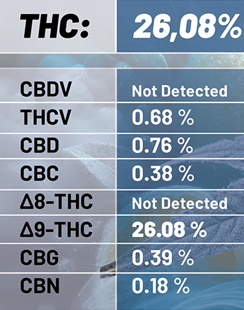 - Effect: euforisch en ontspannen, zeer sterk effect, 25% THC, goed tegen stress