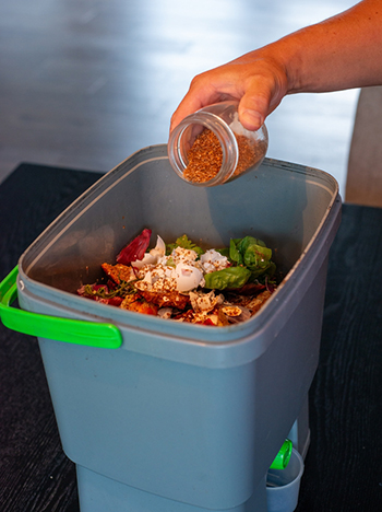 De fermentatie vindt plaats in een luchtdichte emmer. Je opent gewoon de container, en gooit er je keukenafval en plantenresten in. Vervolgens strooi je er een paar handjes micro-organismen overheen om het weer af te breken. Dat is alles wat je in de dagelijkse praktijk hoeft te doen.