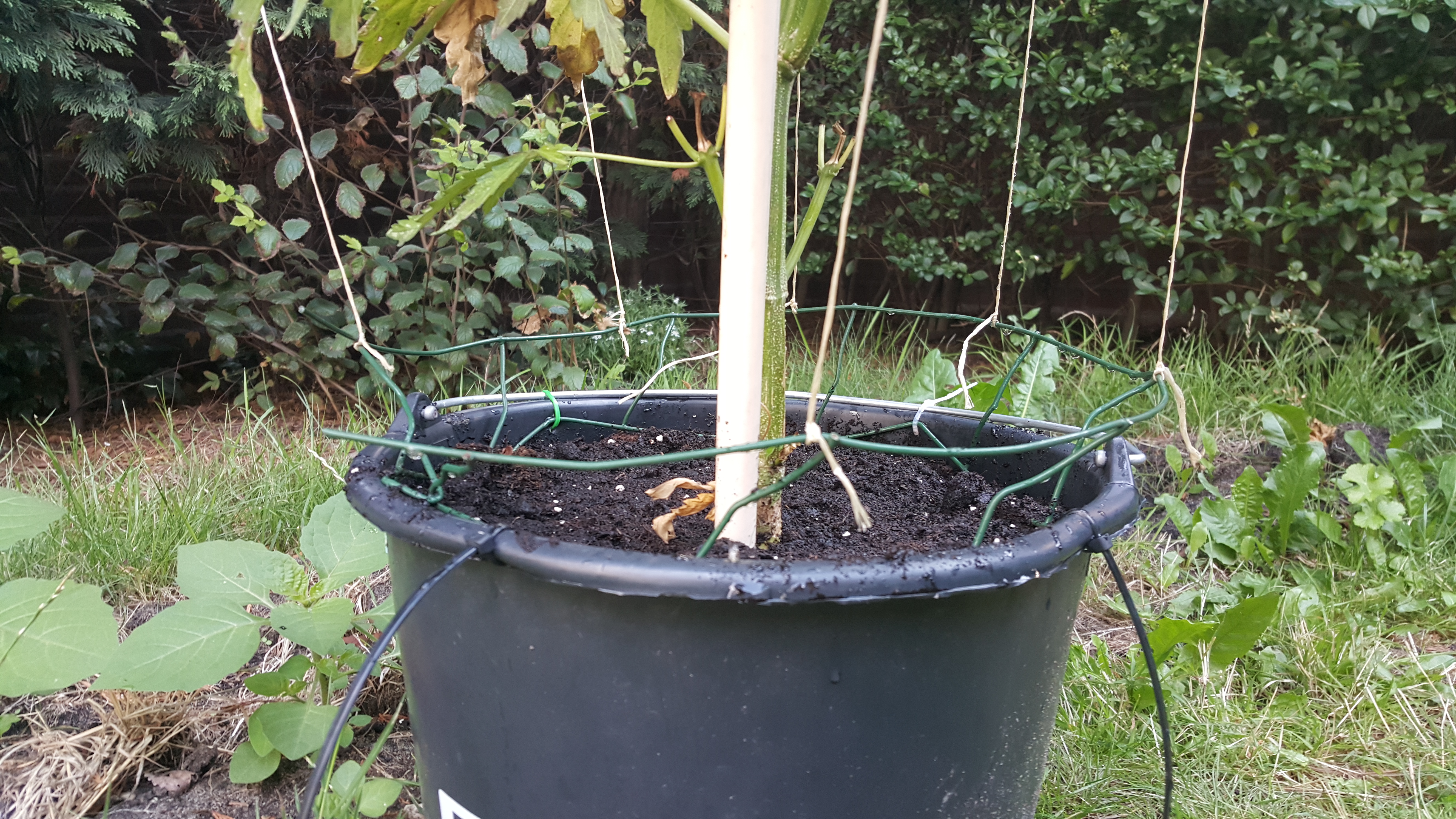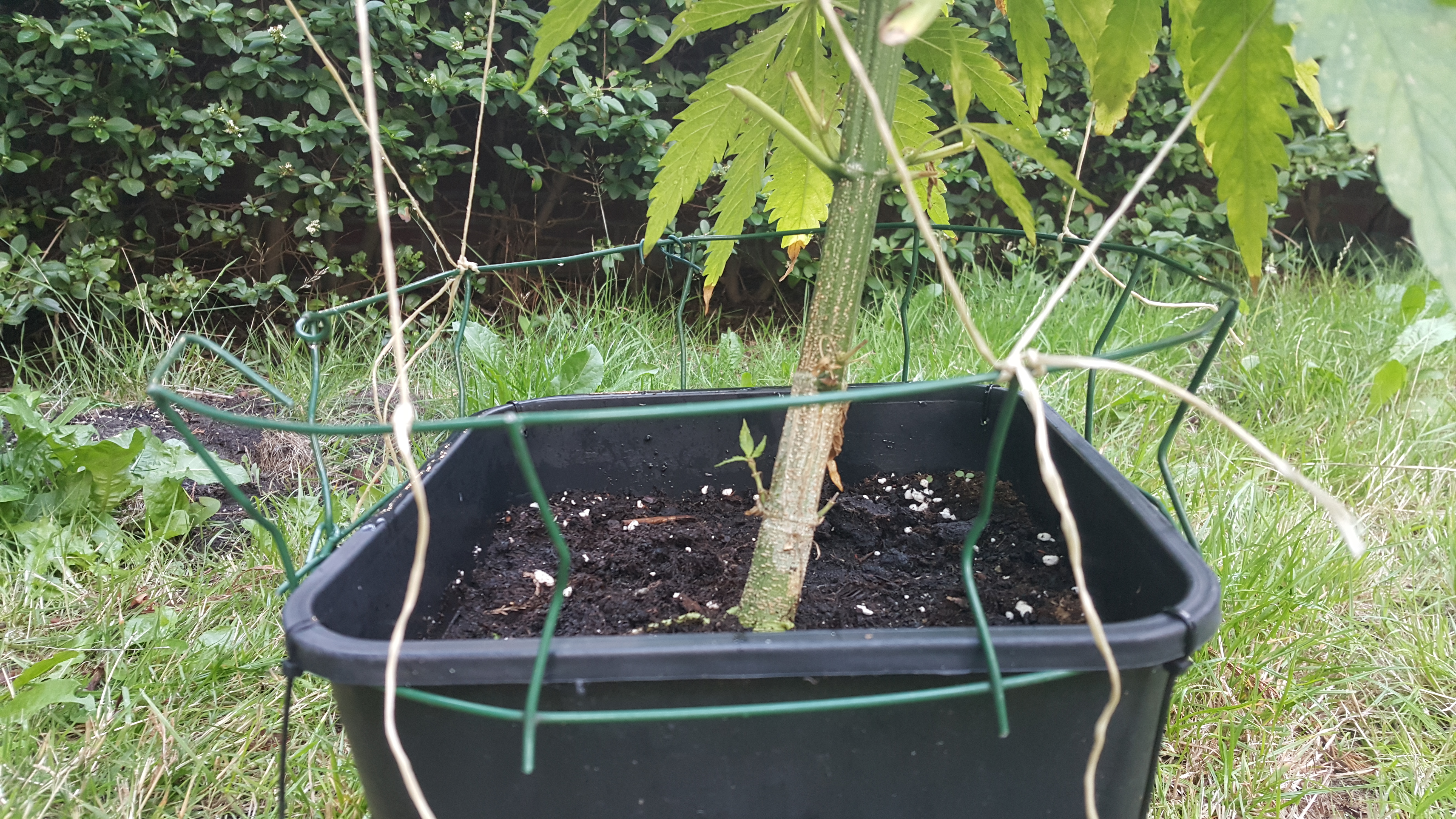 Om dit te bereiken heb ik een stuk gaas aan de pot vastgemaakt waaraan ik de takken naar beneden kan binden. Nu is het slechts een kwestie van tak voor tak naar beneden binden met touw. In een kwartiertje tijd, zijn mijn planten op deze manier een flink stuk lager geworden. Wanneer je dit doet zul je zien dat de topjes zich al na een paar uur omhoog richten naar de zon.