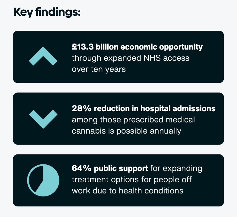 In het komende decennium zou toegang tot medicinale cannabis liefst 15 miljard euro (€1,5 miljard per jaar) kunnen toevoegen aan de Britse economie, door een hogere arbeidsmarktparticipatie en minder ziekteverzuim.