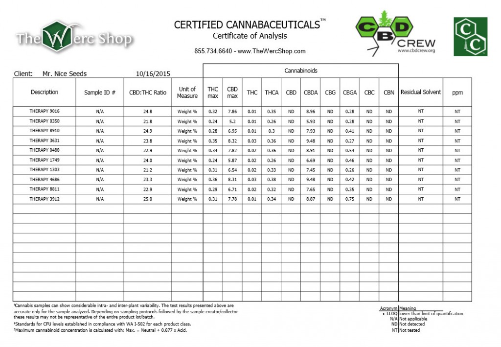 CBD Therapy. Zo heet de nieuwste toevoeging aan de medicinale wietsoorten van CBD Crew. Het is een bijzondere wietsoort die uitermate geschikt is voor patiënten die niet stoned willen worden zoals kinderen, huisdieren, ouderen en verder iedereen die de cannabis high gewoon geen prettige bijwerking vindt. Het CBD percentage ligt iets boven de 8 procent terwijl de wiet maar 0,35 procent THC bevat, en dat maakt deze soort nagenoeg legaal.