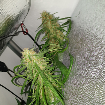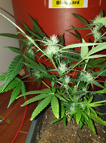 Nu, in de derde week van deze kweek, staat ze vol in bloei! Het is geen grote plant maar er zitten aardig wat toppen aan. In de Space Bucket hangt een LED lamp(je) met een verbruik van slechts 24 Watt. Toen ik de plant even uit de Space Bucket nam, merkt ik dat het zelfgemaakte koolstoffilter goed zijn werk doet. Het kleine plantje ruikt bijna net zo sterk als de grote dames!