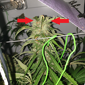 Tijdens het meten kwam ik er ook achter dat er een nieuwe koploper is en dat had ik niet verwacht. Het is tot mijn verbazing de top die eerder wat te dicht bij de lamp groeide, en daardoor een verbrand plekje heeft. Deze groeit daardoor niet meer in een punt maar is vlak een de bovenzijde. Het lijkt erop alsof de bovenkant er afgeknipt is. Is dit wellicht een per ongeluk uitgevoerde vorm van Bud Swelling? Ik heb dit exemplaar dan ook maar is opgemeten op de punten aangegeven op de foto (hieronder links) en ik ontdekte daar een diameter van 5.91 centimeter boven in de top.