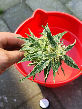 Na het bud washing fiasco liet ik het maar even voor gezien. Maar de volgende dag (gisteren) heb ik de schaar toch maar weer ter hand genomen, want ik wilde voorkomen dat de andere planten ook last zouden krijgen. De overige vier autoflowers heb ik daarom ook maar geoogst. Ze hadden misschien nog één of twee dagen van de zon kunnen genieten maar ze waren ook klaar. Bovendien wilde ik niet het risico lopen dat ze ineens een onweersbui voor hun kiezen zouden krijgen.