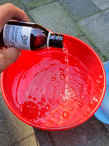 Jammer maar niet getreurd want meeldauw zou je ook met baking soda (geen bakpoeder dus maar zuiveringszout) kunnen wegwassen. Kwam dat even goed uit want dat had ik nog staan. In emmertje twee een flinke schep gedaan, en nog eens geprobeerd maar ook dit keer zonder succes.