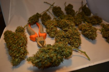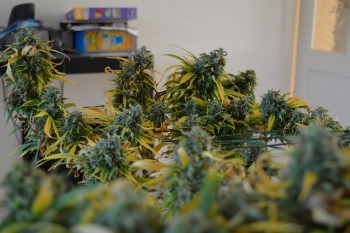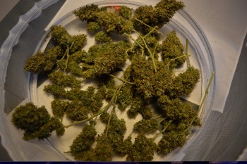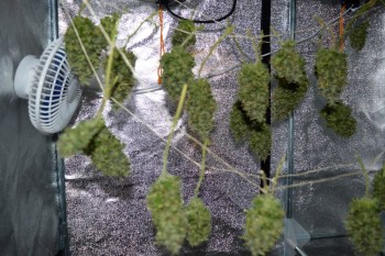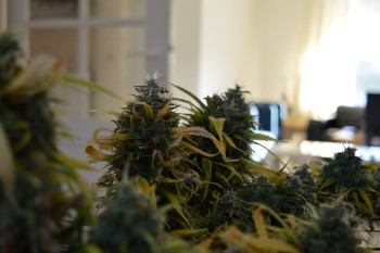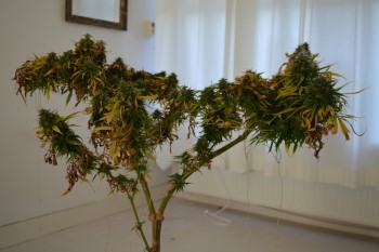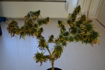 Op 26 november haalde ik de plant uit de tent voor de oogst. Zo’n beetje alle bladeren waren inmiddels vergeeld en de toppen waren mooi rijp geworden. Ik zette de plant midden in mijn woonkamer en knipte een voor een de toppen eraf. Met een dienblad op schoot en een lekker muziekje heb ik tot middernacht zitten knippen. De toppen plakte aan alle kanten en een heerlijke zoete hazegeur vulde mijn kamer.