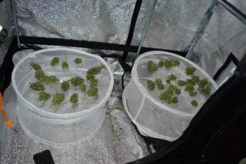 Veel foto’s van de groeifase heb ik eerlijk gezegd niet gemaakt omdat ik eigenlijk niet veel van de plant verwacht had, mijn hoop was immers gevestigd op de kushdames. Op 17 september 2015 zaten er nog maar een paar eerste bloeihaartjes aan de Silver Star Haze zoals je op de foto hierboven kunt zien. Op die dag haalde ik de plant naar binnen en zette ik haar onder de ledlampen. Ze paste maar net in mijn kleine kweektentje van 60 x 90 centimeter. Ik verspreidde de takken zo goed als ik kon met behulp van een oud stuk tuingaas, hieronder zie je de plant voor het eerst in haar nieuwe onderkomen.