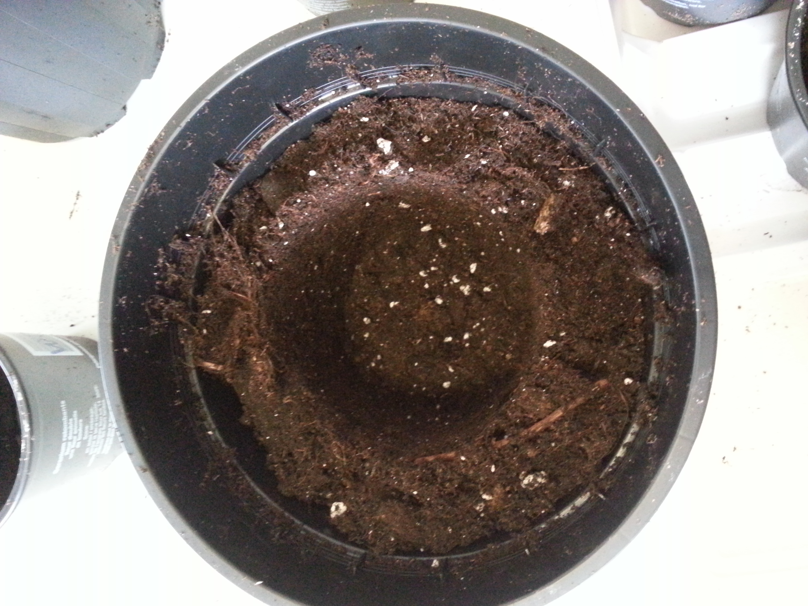 Ik heb de planten halverwege de week over gepot in drie liter potten met batmix van Plagron, een sterk voorbemest aardemengsel op basis van vleermuizenmest. Ik heb bij het overpotten een handig foefje gebruikt wat ik bij Bio Bertje afgekeken heb. Door eerst het plantje met potje en al in te graven krijg je namelijk een kuil waarin de kluit precies past. Op deze foto’s kun je duidelijk zien wat ik bedoel.