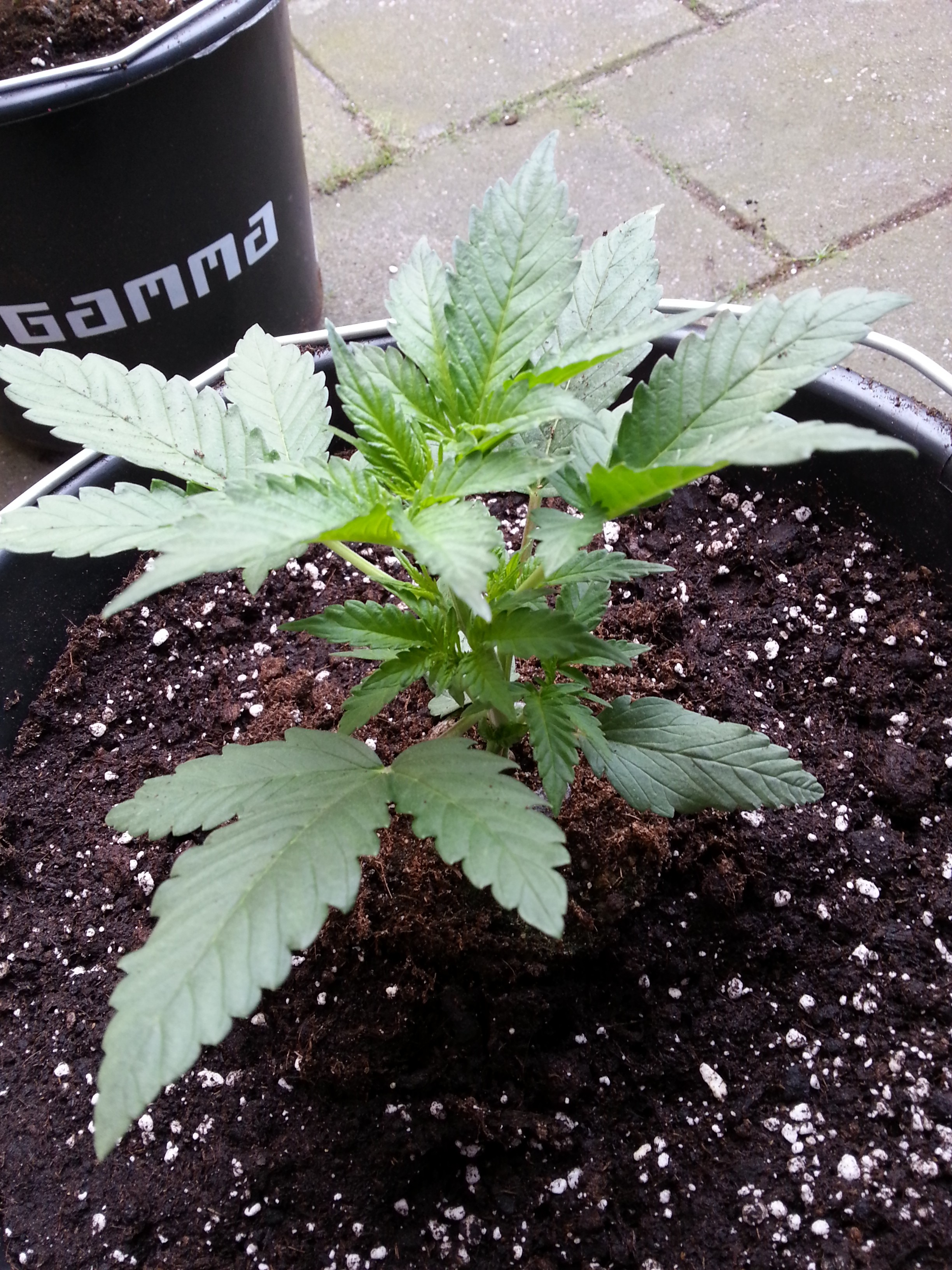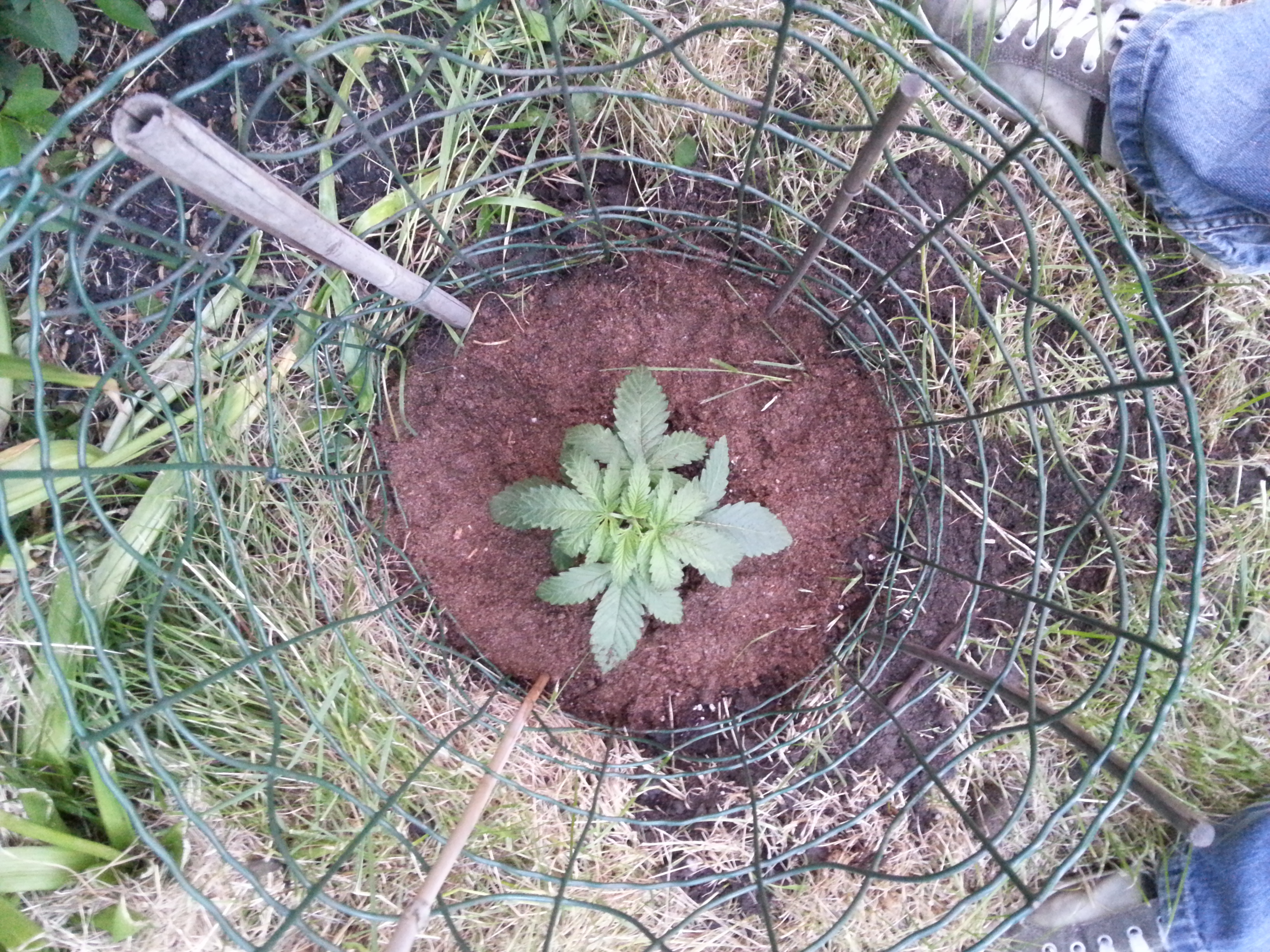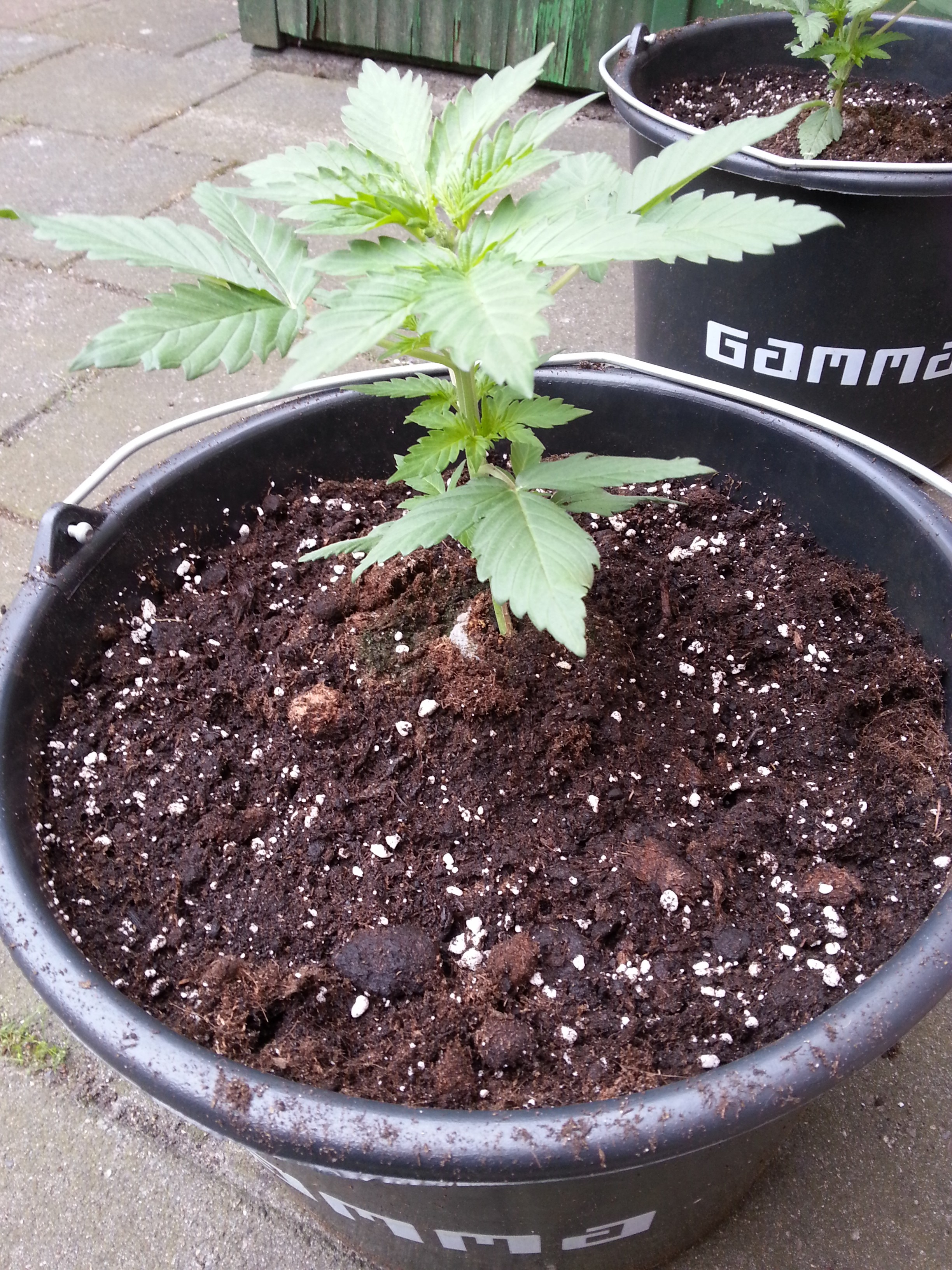 De Passion #1 en Frisian Dew van Dutch Passion heb ik, helemaal volgens planning, in de volle grond achter in mijn tuin gezet. Hun wortels kunnen in de volle grond ongelimiteerd doorgroeien zodat de twee planten straks hopelijk uitgroeien tot mooie grote planten. Omdat ik ze niet boven de heg wil laten uitkomen, zal ik de hoogte later met wat scrog technieken beperken. Ter voorbereiding daarop heb ik de planten daarom gefimd. Fimmen is een techniek waarbij je het bovenste deel uit het topje van de plant haalt, het levert een wietplant minder stress op dan toppen. Zo krijg ik straks (als het goed is) vier of meer hoofdtoppen die ik horizontaal langs een gaas zal leiden. Zo kan ik de hoogte van de twee volle grond planten beperken en krijg ik straks hopelijk een heleboel grote toppen die allemaal evenveel in de zon staan.
