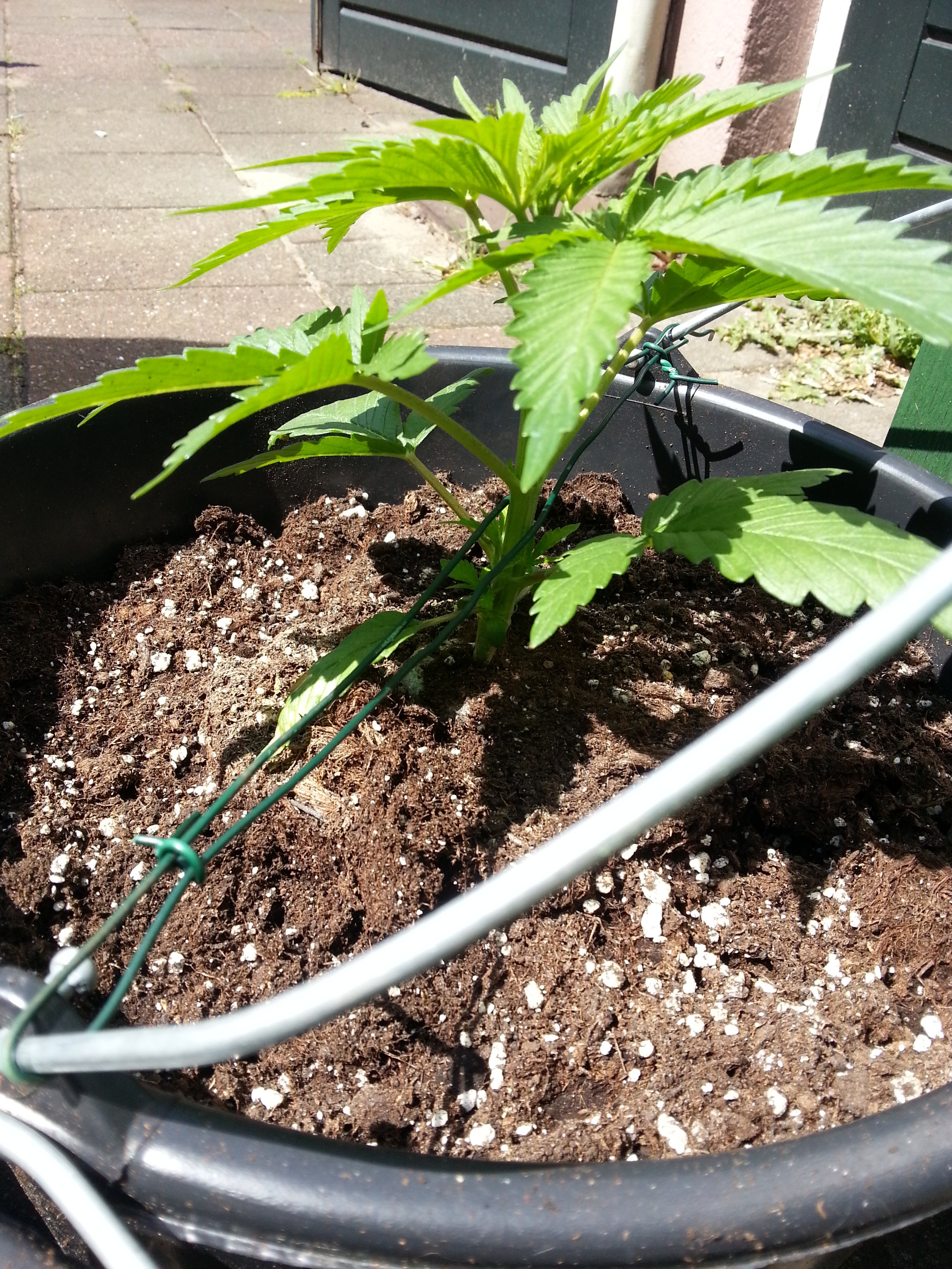 De Early Skunk plant stond na de eerste nachten buiten niet zo stevig in de grond. Of het door de wind gekomen is, of dat de plant al een wat zwakke penwortel had weet ik niet zeker. In ieder geval heb ik hem met een draad verstevigd, zodat hij niet alle kanten op wordt geblazen door de wind. Dit heeft goed geholpen want inmiddels staat hij weer een stuk steviger verankert in de grond.