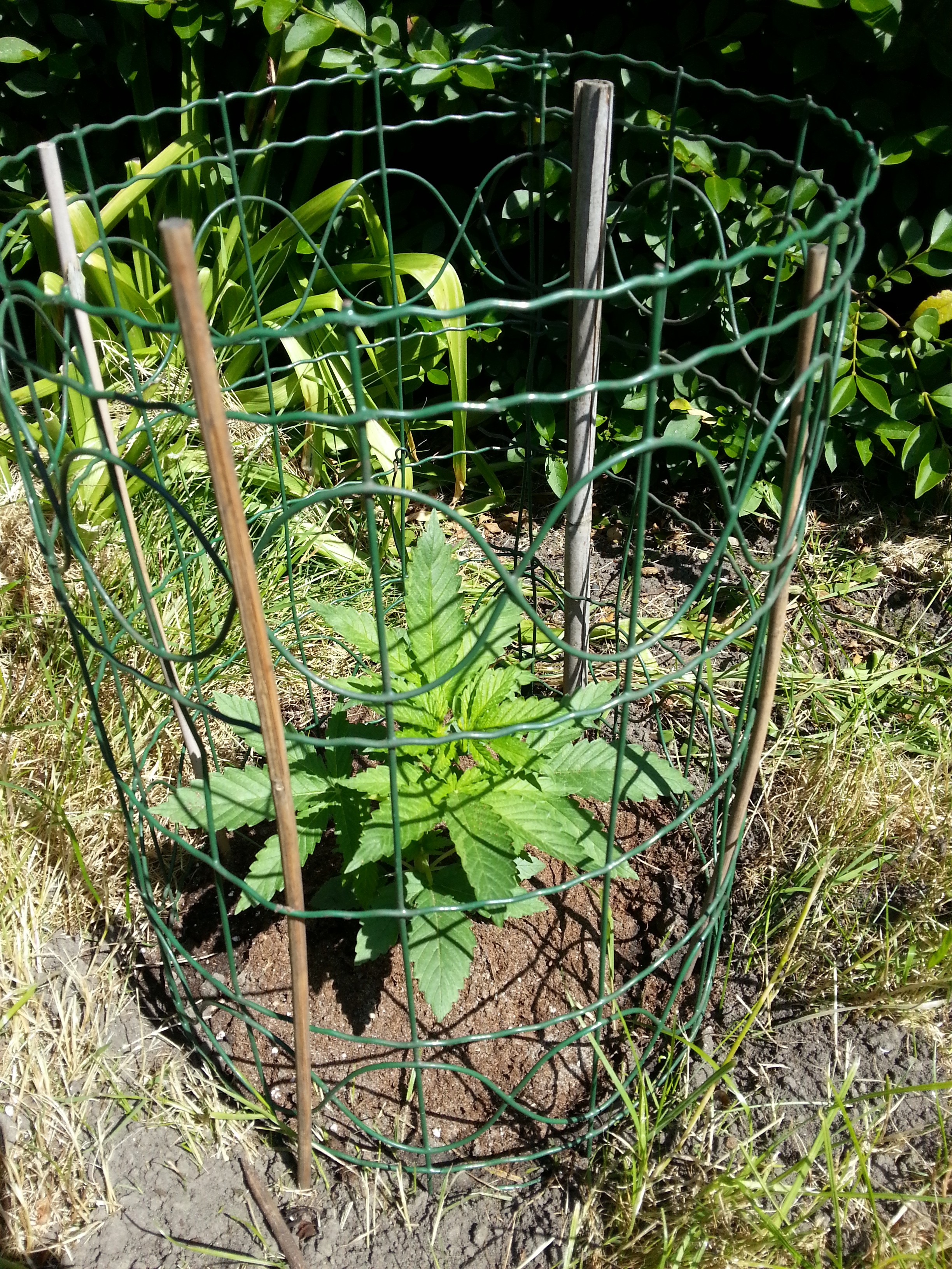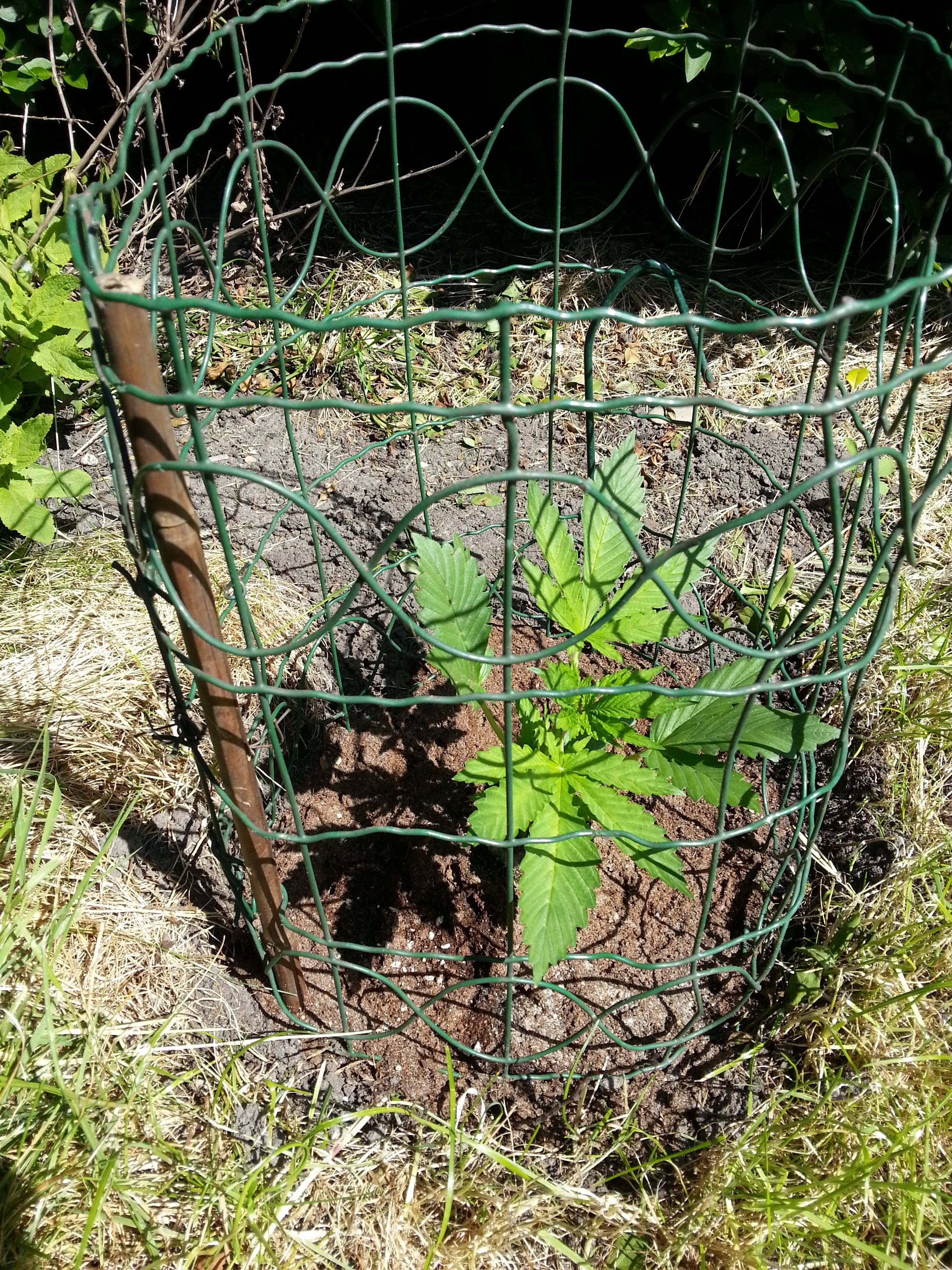 Zoals je op de foto’s kunt zien heb ik de twee volle grond planten beschermd met wat gaas. Hongerige dieren kunnen er zo niet bij en ook kan ik de nieuwe hoofdtoppen na het fimmen er straks makkelijk aan vast binden. Inmiddels zijn de planten alweer een stukje groter dan op deze foto’s, maar helaas zag ik vanmorgen dat de Frisian Dew ook door een insect was opgemerkt. In een van de nieuwste blaadjes zaten een aantal gaatjes. Ik maak me er niet zoveel zorgen over, maar houd het natuurlijk wel scherp in de gaten. Ik kon geen beestjes op de plant ontdekken, dus ga ik ervan uit dat het een eenmalige actie is. Het blijven natuurlijk ook buitenplanten.