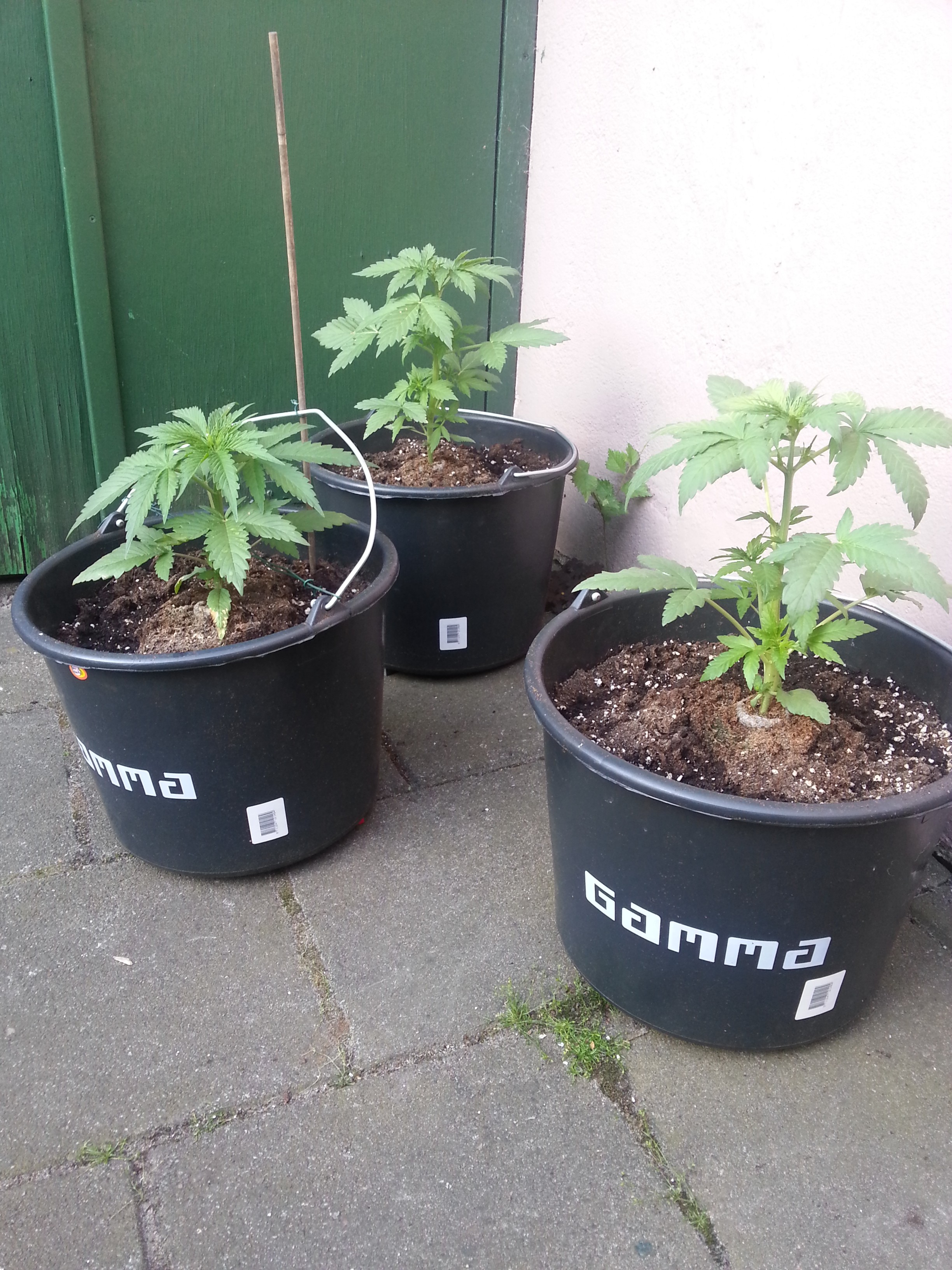 Hoi wietvrienden, hier ben ik weer met een nieuw verslag van het buitenwietfront. Vorige week heb ik de planten over gepot en buiten gezet. Daarna is het supersnel gegaan met de dames, ze genoten zichtbaar van de verse buitenlucht. Drie dagen nadat ik ze naar de drie liter potten overplaatste zag ik alweer de nodige wortels aan de onderkant uit de potten steken. Inmiddels heb ik ze daarom weer over gepot. Naar hun definitieve bestemming dit keer. Ik heb hierbij weer eerst de plant met pot ingegraven, zodat een gat ontstaat waar de kluit precies in past. In het verslag van vorige week kun je zien hoe dit werkt.