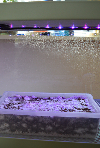 De grote bak met Cubensis broedsel staat echter al even in een bulk-medium (kokos, vermiculiet en een klein beetje gips), en heb ik vanmorgen in ‘fruiting conditions’ gezet. Dat betekent dat de deksel eraf mag, en de bak in een ruimte met een hele hoge luchtvochtigheid komt. De ruimte die ik hiervoor gereserveerd heb is de bovenste plank van een prototype paddo-kweekkastje dat ik gemaakt heb.