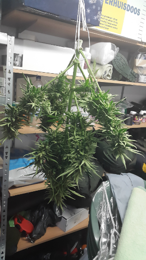 De AutoUltimate hangt as we speak op z’n kop in mijn garage te drogen. Ik heb haar ontdaan van de grootste schutbladeren en daarna afgeknipt en opgehangen. De reden dat ik dit doe is omdat ik het veel makkelijker vind knippen als de bladeren helemaal droog zijn, je hoeft ze dan maar aan te raken met je schaartje en ze breken al af. Zodra ze droog is zal ik jullie laten weten hoe ze smaakt en hoe de high is. Maar eerlijk gezegd ben ik voor de potentie niet zo bang want ze is bedekt met spierwitte kristallen.