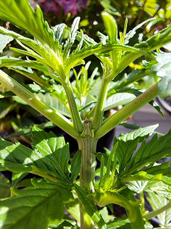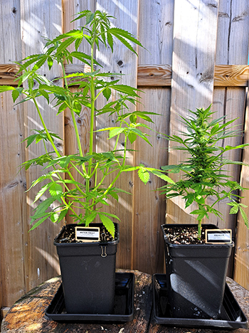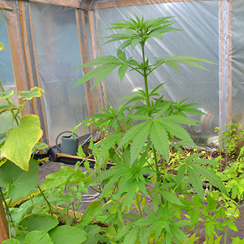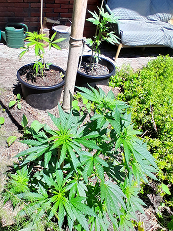 De Zmäkdaun dames (zie hieronder) groeien ook mooi door. Ze hebben een dikke indica structuur en bladeren. De planten in de kas zijn iets langer en hoger omdat ze onder plastic staan. De dame in de volle grond heeft het wel naar haar zin. Deze groeit iets breder en lager.