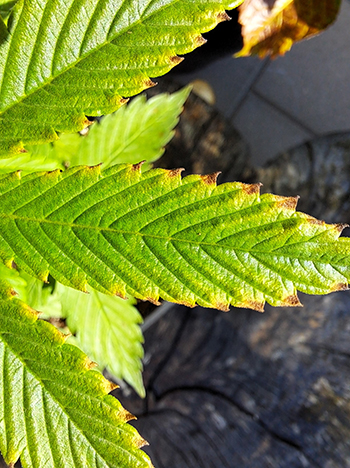 Ook de Zmäkdaun hieronder kan zeker een groeistuip gebruiken. Het blad is erg licht maar deze heeft dan ook veel te veel water gehad. Ik behandel de plant met een knoflook-oplossing tegen de insecten die gaatjes maken in het blad. Ik dacht altijd dat het wantsen waren, maar denk nu dat het sap zuigende zweefvliegjes of muggen zijn.