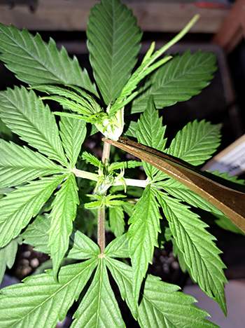 Bijgekomen van de schrik toch nog een laatste keer wat LST om te zorgen dat alle toppen straks genoeg licht en lucht krijgen. Erdbeer was al een stukje volwassener, en toont steeds meer bloeihaartjes. Ik ruik d’r zelf bij vlagen al… Heerlijk! De bladeren van Erdbeer begonnen wel wat verbrande punten te vertonen; iets om in de gaten te houden, dus zij krijgt de aankomende tijd lekker pH-neutraal water.