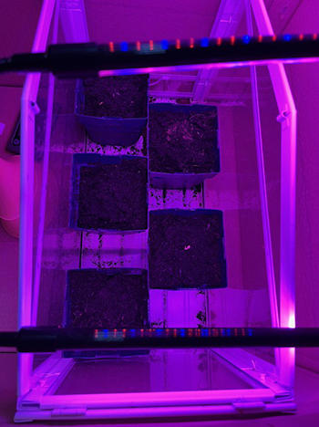 Dat is niet voor elk zaadje even goed geweest. Vijf zaadjes waren ontkiemd maar één is nooit ontkiemd helaas. We zijn begonnen met de groeifase onder een LED-groeilamp. Hier waren we toch niet heel tevreden over, dus toen hebben we ze voor het raam gezet. Daar heeft één babyplantje het helaas het loodje gelegd, en nu hadden we er nog maar vier.