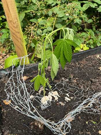 Toen deze vier eenmaal wat groter waren zijn ze naar buiten gegaan in de kas. Ook wij hadden last van een slakken-invasie en die hebben nog twee plantjes opgegeten! Wat vonden we dat jammer. Dus nu hebben we gewoon nog maar twee plantjes over, en daar balen we erg van. Afgelopen maandag is één plantje in de grond buiten gezet, en mijn man hoorde een knakje. We duimen en bidden en hopen dat ze het overleeft!