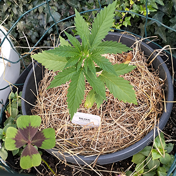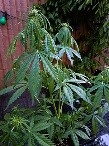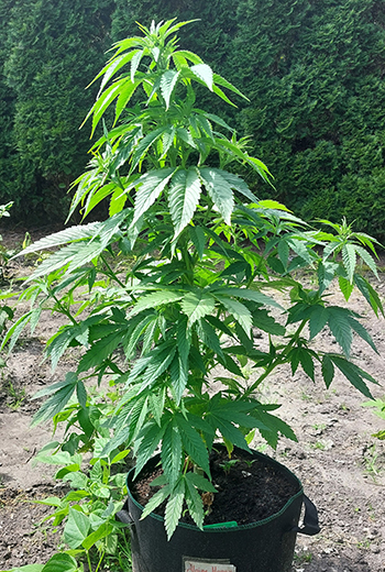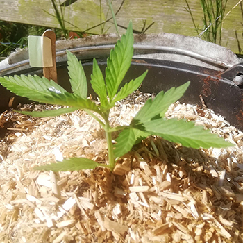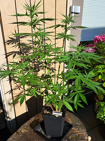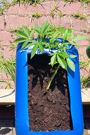 Erdbeer is nu 31 dagen, en daar heb ik al wat LST-training op toegepast. In alle potten heb ik trouwens een textielpot gestopt zodat de wortels niet gaan rond cirkelen. De vijfde plant rechtsvoor op de groepsfoto is een F1-autoflower van een andere breeder. Deze is 45 dagen en in bloei gegaan.