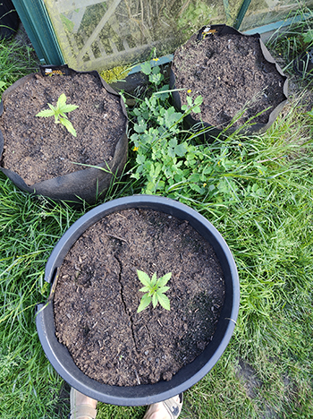 Ook de gefeminiseerde planten Big Yeti en Alpine Honey Melon in textielzakken, hebben geen last meer van slakken. Al zijn ze nog wel in grote getale aanwezig in de moestuin.