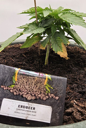 De nageleverde autoflower Erdbeer is al een tijdje geleden ontkiemd en staat voorlopig nog in mijn Dokter Groen kweekkast maar groeit wat compacter dan de andere plantjes. Mijn vermoeden is dat de wortelstimulator toch wat te sterk geconcentreerd was. Ik zal hier beter rekening mee moeten gaan houden, en hoop op verbetering en dat ze nog wat mag strekken.