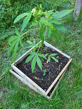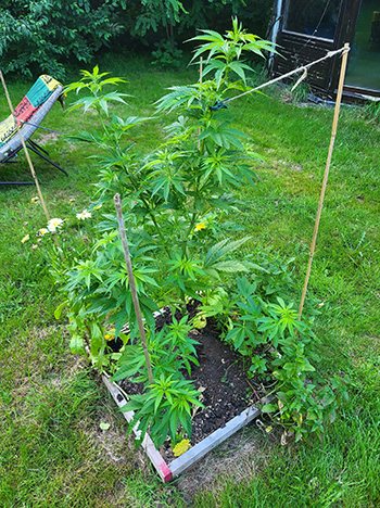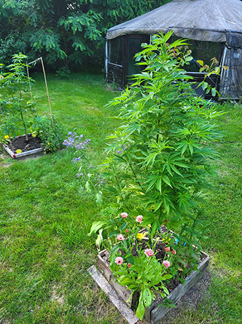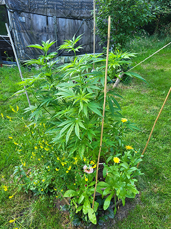 Hier staat mijn grootste dame meer afgedekt maar krijgt ze nog genoeg zonlicht en heeft ze ruimte om verder te groeien 😁 Ze is nu ongeveer 190 cm hoog maar ik zag wel al kleine witte haartjes verschijnen. Ik vermoed de voorbloei dus ze is klaar om toppen te gaan maken maar ze zal nog even moeten wachten 😊
