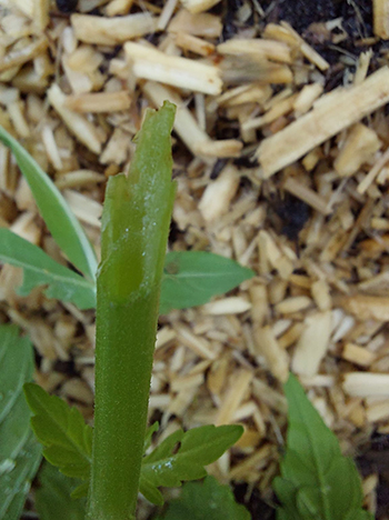 Alleen het steeltje staat nog overeind. De plant ligt er naast. Het lijkt wel of een wezen de plant met een scherpe haal heeft losgemaakt van zijn stam. Niet meer te redden. Gelukkig staat de Alpine Crocket nog overeind. Als laatste. De Erdbeer is drie weken terug opgepeuzeld door een slak. De paar blaadjes die er nog aan zitten, willen niet echt groeien. We geven haar nog even.