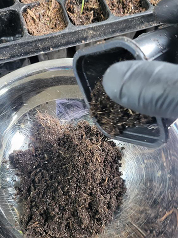 Zoals sommigen van jullie weten was ik altijd een groot voorstander van de peroxide soak manier om zaden te ontkiemen. Maar ik dacht, “ehm we gaan het dit een keer gewoon simpel aanpakken, en de aarde zoveel mogelijk laten doen”. Dus ik meng een simpel biologisch zaai- en stekaarde-mixje met wat mycorrhizae. Deze heb ik toevallig van Organic Earth gekregen en had die nog nooit gebruikt. Dus ik dacht ik pak die mee, dan kunnen we die ook mooi testen voor jullie.