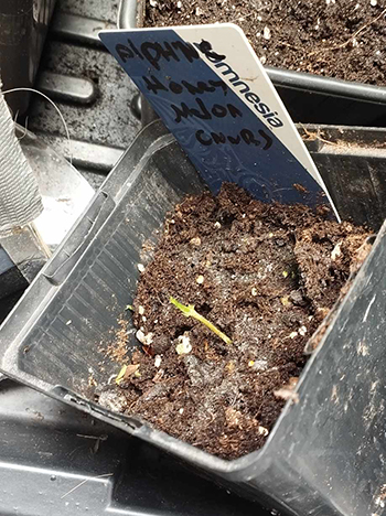 Heb van alle kiemen foto’s; enkel Dutch Treat ben ik vergeten te fotograferen. De Alpine Honey Melon was bij uitstek de grootste kiem, en ik ben benieuwd of dit ook zo zal zijn aan het einde van de rit. Vrijdag 11 april kwam de Alpine Honey Melon al boven.