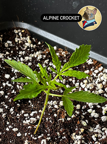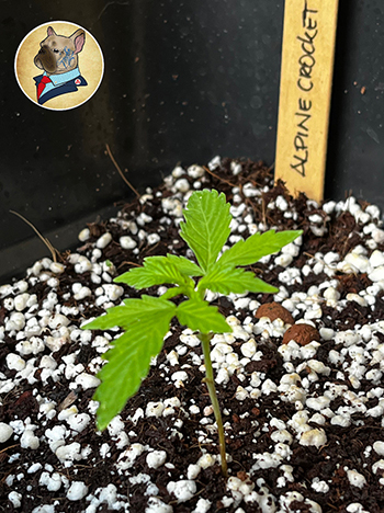 De stoute Alpine Crocket is degene die ons meer zorgen geeft. Na een late ontkiemning is dit plantje van de drie degene autoflowers die echt duidelijk haar best moet doen, om mee te kunnen doen met haar zusjes. Ze ziet er erg fragiel uit. De stengel is een beetje gebogen en de blaadjes zien er zielig uit. Ik denk wel dat het goed komt maar goed, fingers crossed voor deze dame.