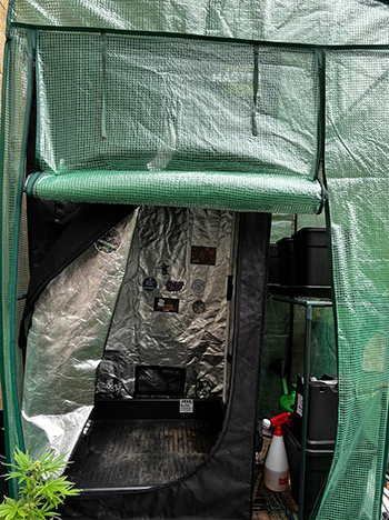 Voor de rest is de voorbereiding voor de fotoperiode-gevoelige zaadjes van de buitenwiet test ook klaar. De tuin-kweekkast is gemonteerd, en daarin hebben wij de 80 x 80 cm kweektent in verstopt. Netjes uit het zicht van pottenkijkers gaan we die als darkroom gebruiken, om de bloei van de lichtgevoelige zaden te forceren.