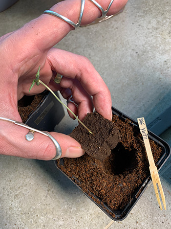 Misschien heeft ze wel gelijk, maar bij deze zag ik dat er een lobblaadje dubbel zat. Volgens mij had ze geen schijn van kans als ik haar niet geholpen had. Toch heb ik dan de billen bij elkaar, zo’n fragiele zaailing opereren is een zenuwslopend karwei. Een lobblaadje brak af, en er waren echt minuscule kartelblaadjes te zien. Spannend, maar ik hield goede hoop!