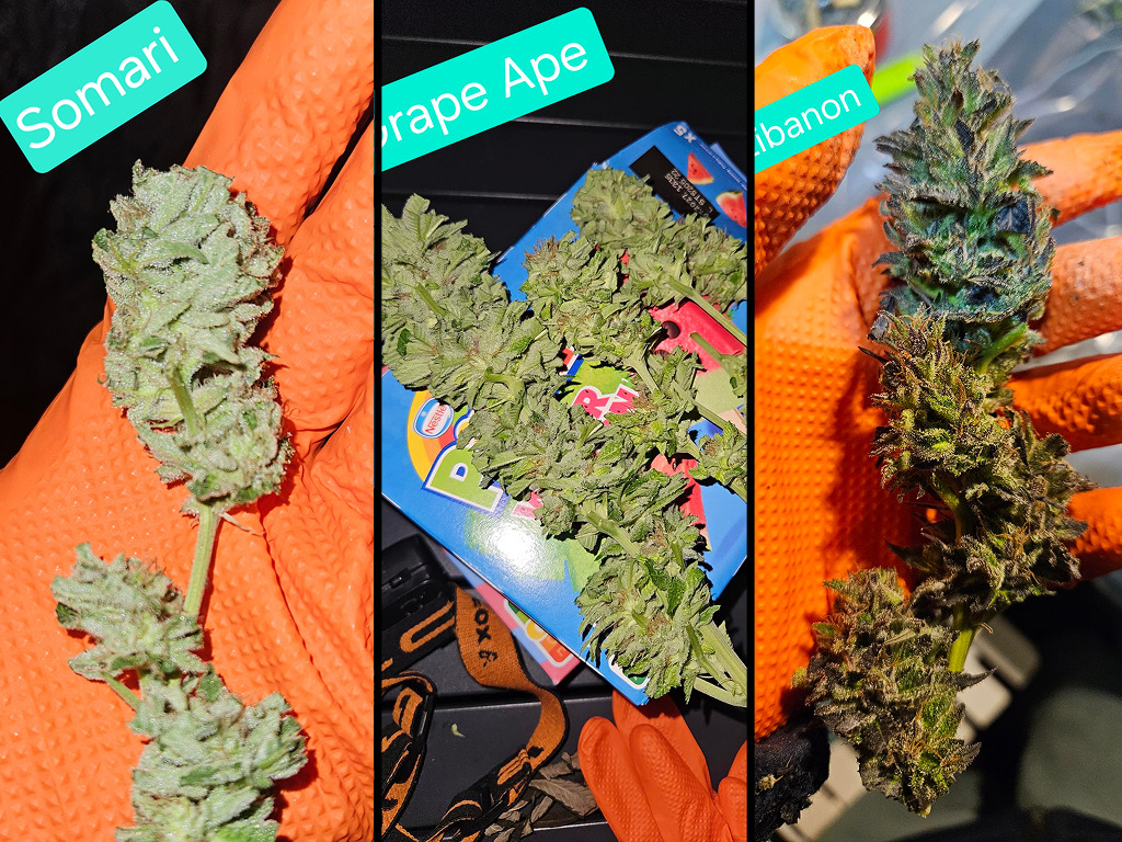De oogst is misschien bescheiden maar Auto Mimosa Punch daar links, ziet er overheerlijk uit! Grape Ape (rb) en Black Lebanon (ro) mogen er ook zijn.