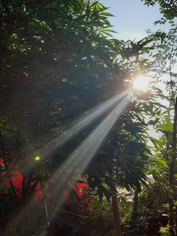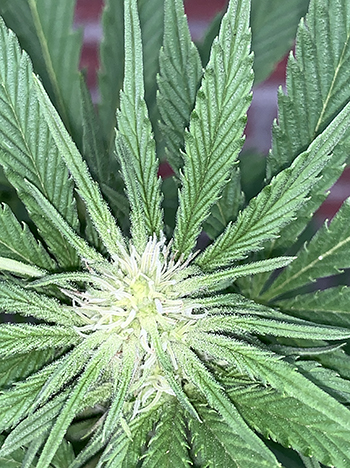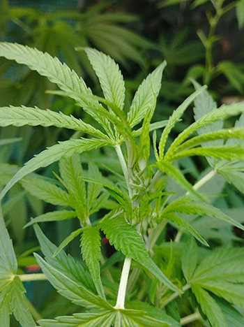 Ik heb een paar weken geleden een aantal takken d.m.v. HST (High Stress Training) ‘omgeknakt’ en daardoor krijgen andere toppen nu ook meer licht. Ik heb de kleinere kansarme toppen onderaan en binnenin de plant weggesnoeid, maar de schutbladeren zoveel mogelijk laten zitten. Hieruit kan ze nog voeding trekken voor de bloei.
